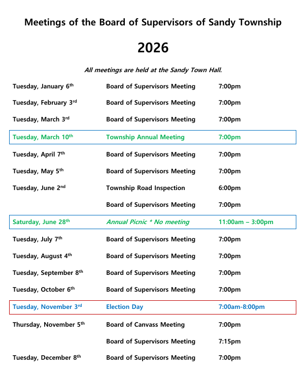 The Sandy Township Board of Supervisors meets on the first Tuesday of each month at the Sandy Town Hall at 7:00 PM unless noted otherwise (on the calendar of meeting dates posted in the kiosk at the Town Hall). The meetings are open to the public. If you have an agenda item or question, please contact the township clerk. Due to elections, dates may be changed.